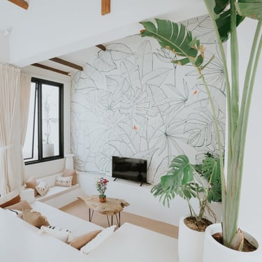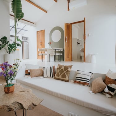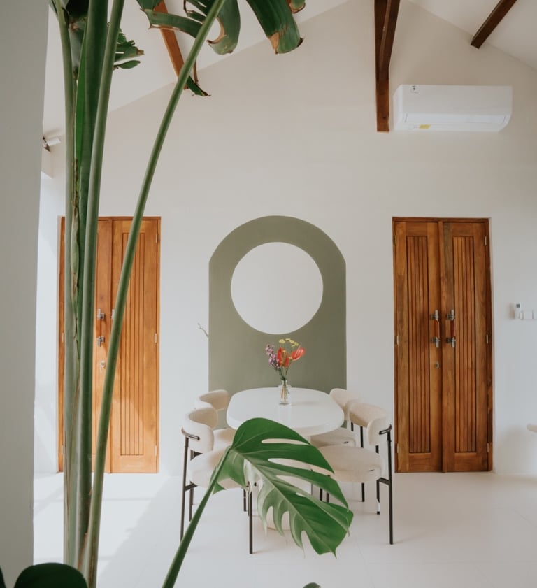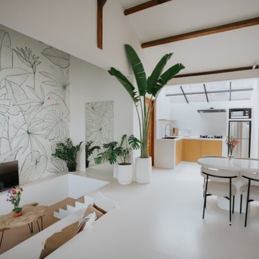 Transform an outdated structure into a high-value, contemporary villa optimized for Bali’s fast-growing short-term rental market. This project expresses our signature blend of warm minimalism and modern tropical living. A soft botanical mural anchors the sunken living room, complemented by organic textures, curated furnishings, and warm wooden accents. Light filters through the space with ease, highlighting the refined palette of whites, beiges, and natural greens. With its open layout, indoor greenery, and crafted architectural details, this villa reflects a calm, textural approach to contemporary Bali living.
